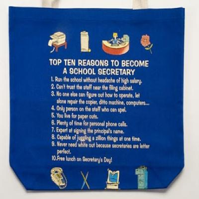 Humorous Top Ten List School Secretary totebag. Great school secretary gift. Heavy natural canvas tote bag 18 in. X 14 in. Funny Top 10 List.