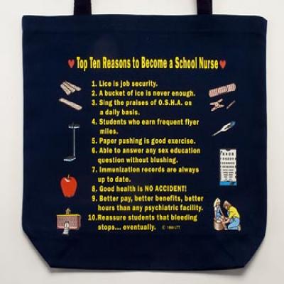 Humorous Top Ten List School Nurse totebag. Great school nurse gift. Heavy natural canvas tote bag 18 in. X 14 in. Funny Top 10 List.