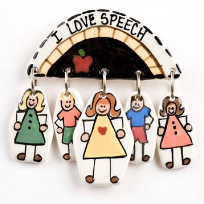 "Hand painted ceramic bar pin with ""I Love Speech"" painted on and cute dangling people pieces. Makes a great teacher gift."