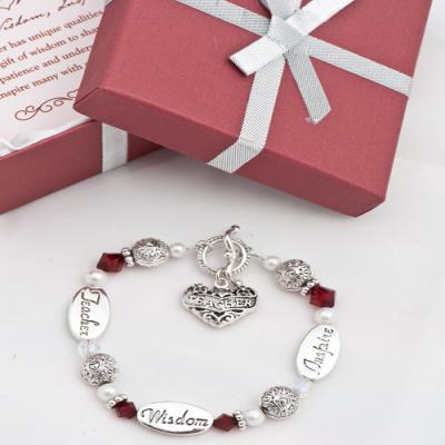 This Teacher Glass Bracelet shows the words Teacher, Wisdom & Inspire. Comes in a lined gift box with Teacher poem inside.