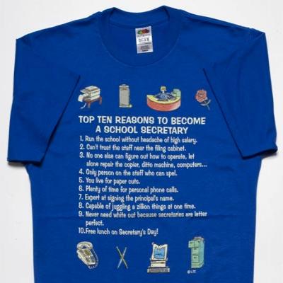 What would a school do with out the secretary that makes sure things are running smoothly. This shirt is a humorous side of the job. Adult royal blue T-shirt 50/50 cotton polyester