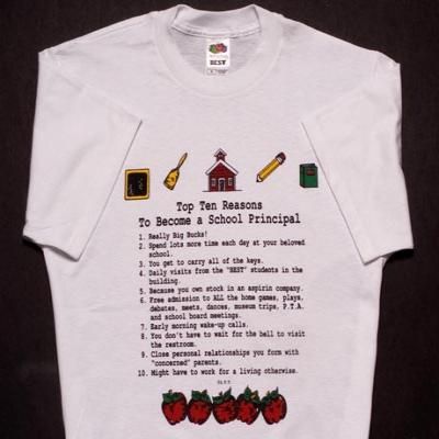 Principals help set the tone for the school building. They encourage the staff . This shirt is the humorous side of the job.Adult white T-shirt 50/50 cotton polyester